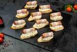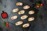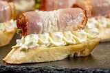 На фуршет мы заказали несколько видов брускетт и канапе, вот эти очень понравились. Супер закуска, мягкий хрустящий багет с беконом и сыром, вкуснейше. Вечеринка была супер!