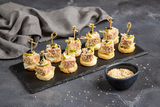Оригинальная закуска, в которой нежное филе тунца сочетается с хрустящим хлебом, свежим салатом Айсберг и пикантным соусом из горчицы и майонеза. Ароматный кунжут добавляет легкую ореховую нотку, а свежесть лайма подчеркивает изысканность вкусов
