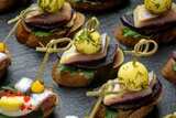 Миниатюрная версия брускетты с оригинальным топпингом на ржаных гренках станет идеальным дополнением фуршета, банкета или любого праздничного стола. Ассорти основано на простом, но эффектном сочетании рыбы и ржаного хлеба, при этом отличается яркой подачей. В составе — кростини с килькой, перепелиным яйцом и икрой тобико, а также кростини с сельдью, мини-картофелем и отварной свеклой. Яркая и сытная закуска, украшенная зеленью, добавит стильный акцент любому мероприятию.