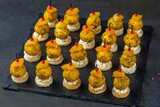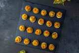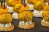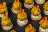 Миниатюрные круглые бутерброды подаются на тостовом хлебе и отличаются сладковатым вкусом благодаря использованию качественной кураги.