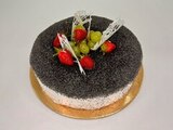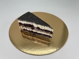 Состав:маковый бисквит, сахарный сироп, черничный конфитюр и крем на основе маскарпоне, заварного крема и взбитых сливок. Украшения : клубника и шоколадные украшения.