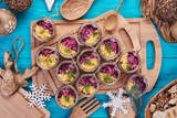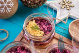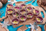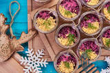 Сельдь, яйцо, картофель, свекла, морковь, майонез, укроп. 12 баночек по 60 гр.