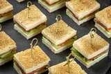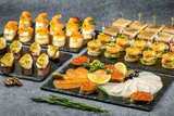 Набор закусок с акцентом на морские вкусы. Мини-сэндвичи с лососем, канапе с креветкой и омлетом томаго, брускетты с манго и креветкой, а также с фламбированной грушей. Дополнен рыбной нарезкой. Отличный выбор для фуршета, вечеринки или делового мероприятия.