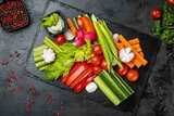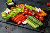 Ассорти овощей: свежие огурцы, болгарский перец, томаты черри, редис, сельдерей и морковь с пикантным соусом "Blue cheese".